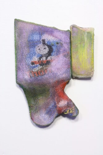 Vehicular Manslaughter, acrylic paint and vinyl sticker on stretched polytab mural fabric. Size: 18” x 24”. 2025.