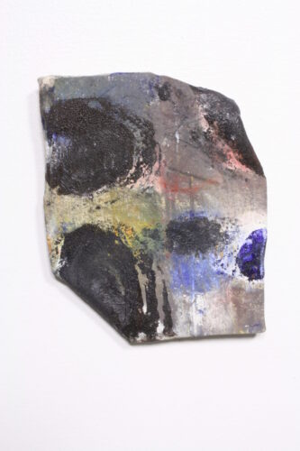 Wake Up and Smell, fine artist oil paint, canvas drop-cloth, used and abused old art scraps, debris, mildew, fungus, herpes, staples. Dimensions: 5 100/200″ tall mas o menos