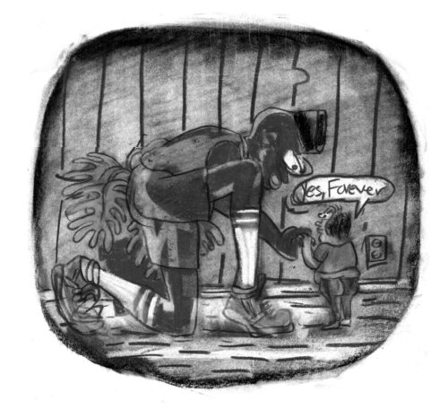 Find the 2: Side Hug, markers and colored pencil on Bristol board, 6” x 4”, 2023.