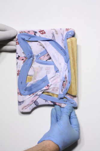 Three Horrible Nights, wood, canvas drop-cloth, cotton underwear (SpongeBob Edition), staples. Dimensions: 45/5″ tall -+, 2012