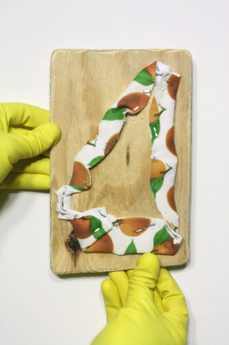 Bubble Bath, oil paint on abandoned stretched painting with Oriented Strand Board (OSB) wooden artist’s frame. Size: welcome floor mat. 20l9.