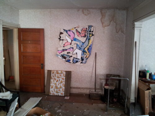 Cereal Yogurt Banana, plastic drop cloth, oil paint, plastic party table covers. Size: Garage Door. 201g.       (install shot: folded almost in half)   full frontal viewpoint perspective