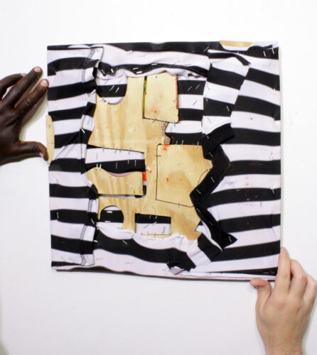 Vehicular Manslaughter, acrylic paint and vinyl sticker on stretched polytab mural fabric. Size: 18” x 24”. 2025.