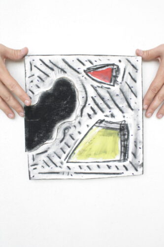 Find the 2: Side Hug, markers and colored pencil on Bristol board, 6” x 4”, 2023.