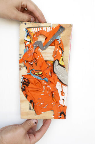 Vehicular Manslaughter, acrylic paint and vinyl sticker on stretched polytab mural fabric. Size: 18” x 24”. 2025.