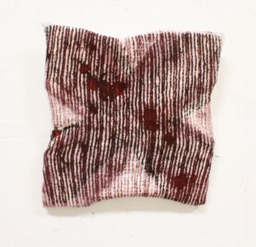 X Rug, oil, particle board, bathmat, staples, tub scum, and grime, 2011, 8 2/3″ x 8 23/45″