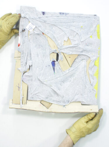 Bubble Bath, oil paint on abandoned stretched painting with Oriented Strand Board (OSB) wooden artist’s frame. Size: welcome floor mat. 20l9.