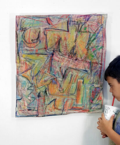 Luck or Skill, oil paint, ink, sandwiched between plastic paintings tarps. Size: double car garage door (extended). 2ol9.         there’s about 3.1 million different ways to install this painting.
