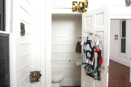 Bubble Bath, oil paint on abandoned stretched painting with Oriented Strand Board (OSB) wooden artist’s frame. Size: welcome floor mat. 20l9.