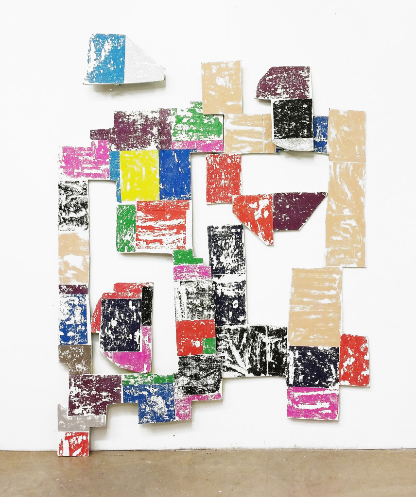 Me Last Night, found plywood, xerox transfers, house primer, paper pulp, two screw eye hooks, packaged Keebler Cheese and Peanut Butter Sandwich Crackers. Size: XXL. 2021.