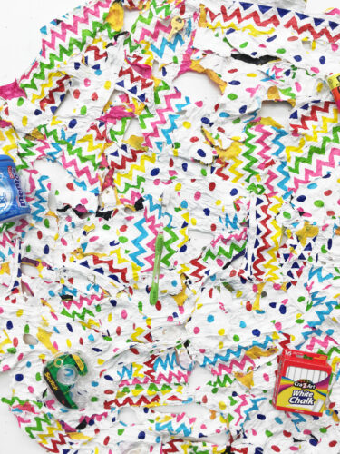 Find the 2: Friendly Reminder, acrylic on polytab installed on 24 cardboard boxes, ~60” x 60” x 200”, 2023. VIDEO: Find the 2