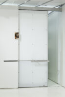 Cereal Yogurt Banana, plastic drop cloth, oil paint, plastic party table covers. Size: Garage Door. 201g.       (install shot: folded almost in half)   full frontal viewpoint perspective