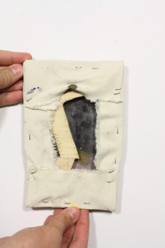 “Keep and Clean Your Dirty Sex Fights” — Kevin Tocino, oil, ink, gamsol scum, clorox bleach, canvas, found wood, staples, 2011, 8″ x 4.556663239389298383929238292300329834282920320323293289320032932893203429239832932040432932093203293420903293290320″