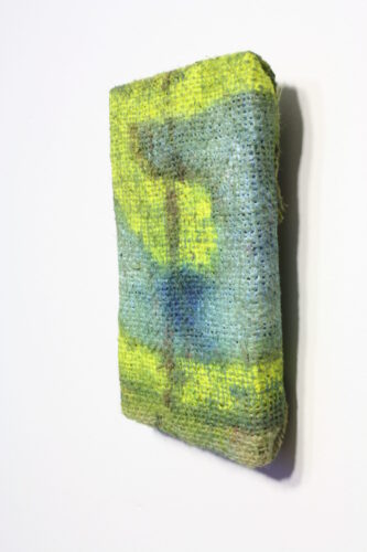 A Man Walked Into A Bar, oil, green chile burlap potato sack, discarded art pieces, staples, 2011, (6+1)” x 3 19/20″