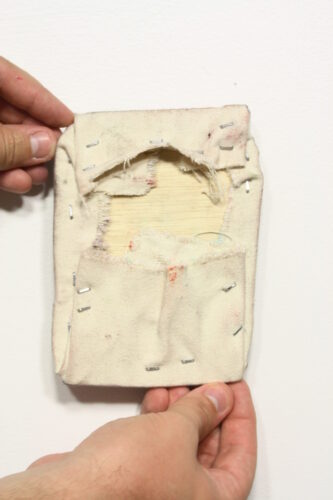 Raise D Roof And Shoot Em On Down, oil, paint residue, wood, discarded art scraps, canvas, staples, and those little wooden wedges that come with pre-made painting stretchers, 2011, 12/2″ x 8/2″