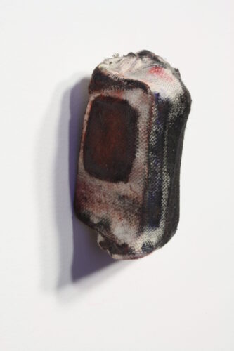 It S Better 2 B Jaded Then Naive, oil, painters canvas drop cloth, discarded art bits, wood, board, plywood and playwood, elbow grease, staples, 2011, 5″ x 4″ x 4 1/177″