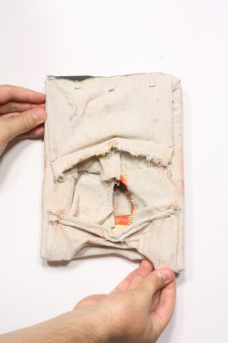 Bubble Bath, oil paint on abandoned stretched painting with Oriented Strand Board (OSB) wooden artist’s frame. Size: welcome floor mat. 20l9.