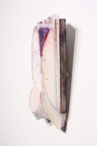 Angel Aragon, fine artist oil paint, crotch mesh from an old pair of my swimming trunks, discarded art pieces, scrap wood, boogers, staples, 2011, 11 1/21″ x 7 1/2″