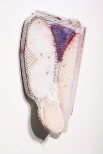 Angel Aragon, fine artist oil paint, crotch mesh from an old pair of my swimming trunks, discarded art pieces, scrap wood, boogers, staples, 2011, 11 1/21″ x 7 1/2″