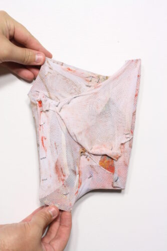 Antonio Estupinan, oil paint, the white mesh from the inside of my old swimming trunks, reborn art stretcher pieces, staples, 2011, 13 1/2″ x 7 1/17″