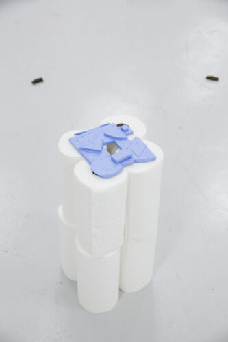 Find the 2: Friendly Reminder, acrylic on polytab installed on 24 cardboard boxes, ~60” x 60” x 200”, 2023. VIDEO: Find the 2