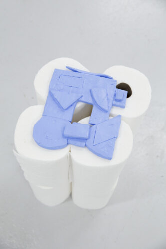 Find the 2: Friendly Reminder, acrylic on polytab installed on 24 cardboard boxes, ~60” x 60” x 200”, 2023. VIDEO: Find the 2