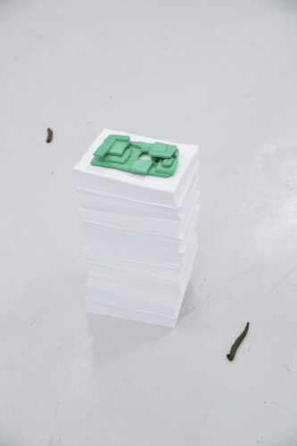 Find the 2: Friendly Reminder, acrylic on polytab installed on 24 cardboard boxes, ~60” x 60” x 200”, 2023. VIDEO: Find the 2