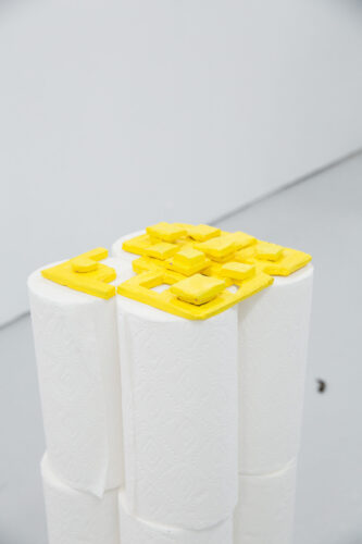 Find the 2: Friendly Reminder, acrylic on polytab installed on 24 cardboard boxes, ~60” x 60” x 200”, 2023. VIDEO: Find the 2