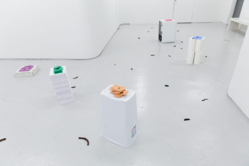 Find the 2: Friendly Reminder, acrylic on polytab installed on 24 cardboard boxes, ~60” x 60” x 200”, 2023. VIDEO: Find the 2
